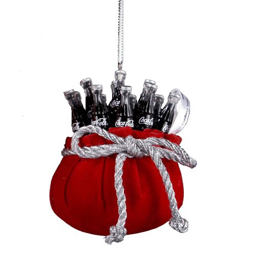 This 3-3/4-inch resin ornament features classic Coca-Cola bottles in a red velvet bag.