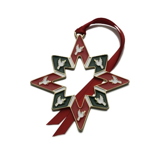 This heirloom quality Wallace Gold-Plated 2012 Star ornament will be a elegant addition to your home décor. Comes with a red ribbon that will add a beautiful touch of joy to a holiday package, tree or mantel. This is the 3rd edition of our treasured annual collectible and features doves on a red or green enameled background with white enameled stripes. Includes a gift boby , protective velvet pouch and is dated with the year 2012. The back of the ornament is flat, gold-plated, stamped with "Wallace Dove Star 2012". Gold-Plated & enameled Star ornament, measures approby imately 4-1/2-inch high.